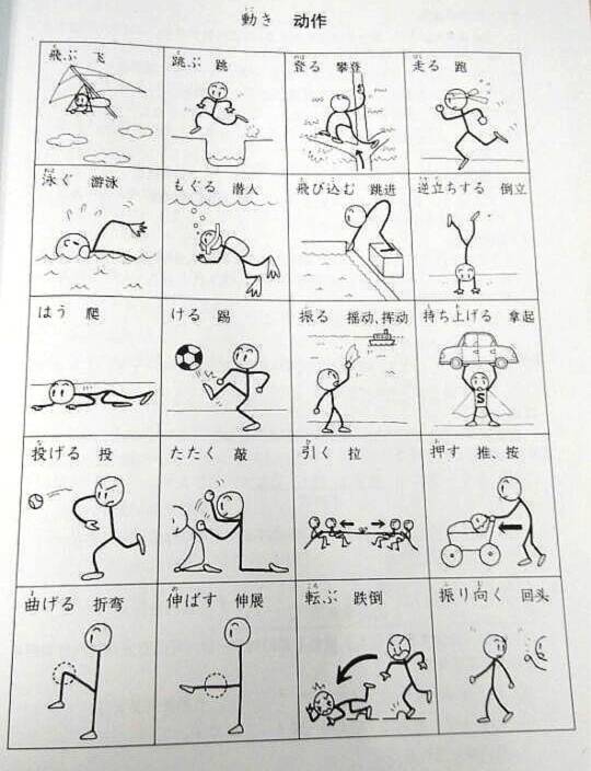 動き:动作飛ぶ(とぶ):飞跳ぶ(とぶ):跳登る(のぼる):攀登走る(はしる):跑泳ぐ(およぐ):游泳潜る(もぐる):潜入飛び込む(とびこむ):跳进逆立ちする(さかだちする):倒立這う(はう):爬蹴る(ける):踢振る(ふる):摇动、挥动持ち上げる(もちあげる):拿起投げる(なげる):投叩く(たたく):敲引く(ひく):拉押す(おす):推、按曲げる(まげる):折弯伸ばす(のばす):伸展転ぶ(ころぶ):跌倒振り向く(ふりむく):回头